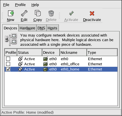 Notice that the Home profile as shown in Figure 19-20 activates the eth0_home logical device, which is associated with eth0.