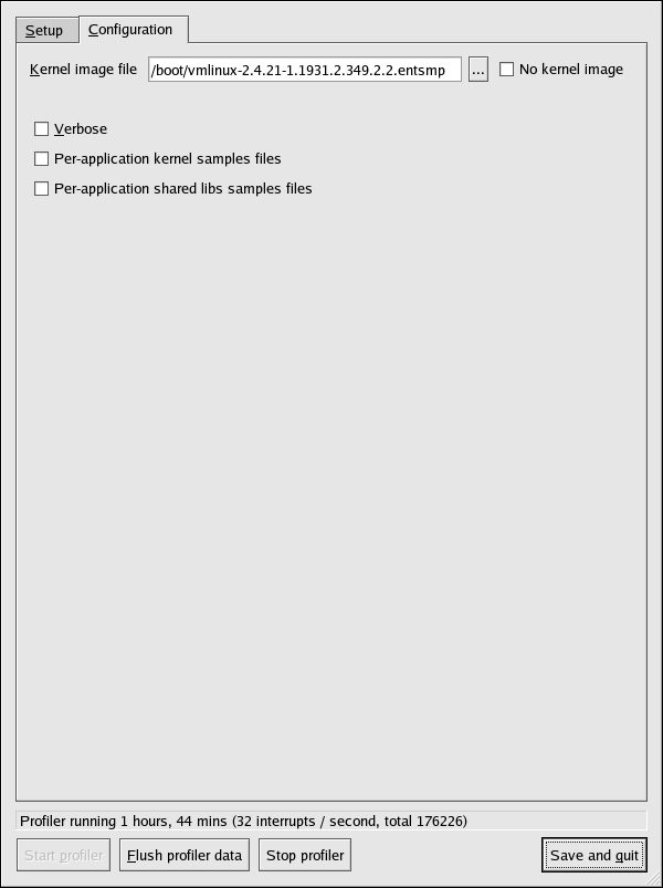 After changing any of the options, they can be saved by clicking the Save and quit button. The preferences are written to /root/.oprofile/daemonrc, and the application exits. Exiting the application does not stop OProfile from sampling.