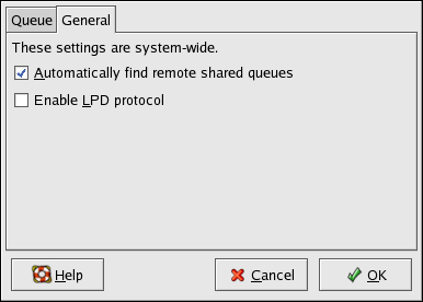 • Automatically find remote shared queues — Selected by default, this option enables IPP browsing, which means that when other machines on the network broadcast the queues that they have, the queues are automatically added to the list of printers available to the system; no additional configuration is required for a printer found from IPP browsing. This option does not automatically share the printers configured on the local system.