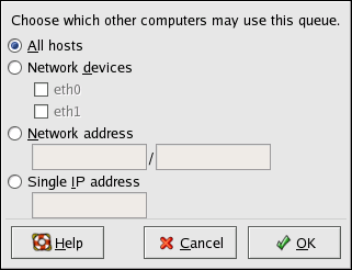 After selecting to share the queue, by default, all hosts are allowed to print to the shared printer. Allowing all systems on the network to print to the queue can be dangerous, especially if the system is directly connected to the Internet. It is recommended that this option be changed by selecting the All hosts entry and clicking the Edit button to display the window shown in Figure 36-18.
