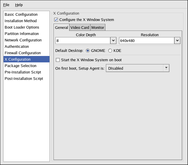 The first step in configuring X is to choose the default color depth and resolution. Select them from their respective pulldown menus. Be sure to specify a color depth and resolution that is compatible with the video card and monitor for the system.