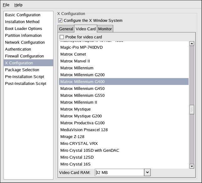 Alternatively, you can select the video card from the list on the Video Card tab as shown in Figure 10-12. Specify the amount of video RAM the selected video card has from the Video Card RAM pulldown menu. These values are used by the installation program to configure the X Window System.