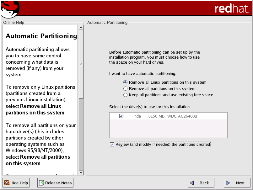 • Remove all Linux partitions on this system — select this option to remove only Linux partitions (partitions created from a previous Linux installation). This will not remove other partitions you may have on your hard drive(s) (such as VFAT or FAT32 partitions).