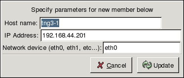Click the Add a New Member Node to create a new cluster member. A window similar to Figure C-5 appears that prompts you to add the Host Name, IP Address, and Network Device of the member node. Once these values are entered, click Update to add the member to the system.
