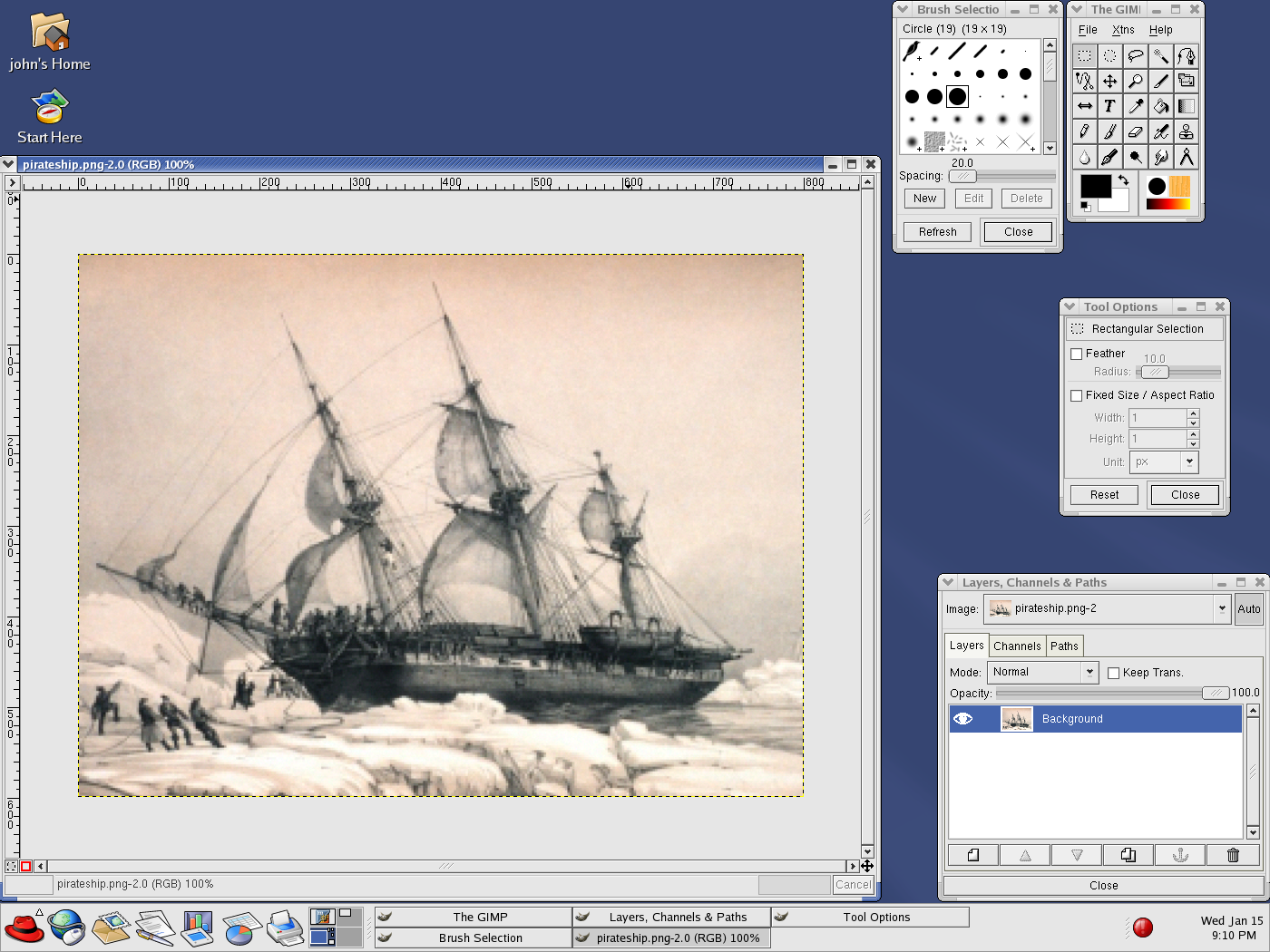 To use the GIMP, you must know some of the basics. Start the GIMP from the desktop by choosing Main Menu => Graphics => The GIMP or from a shell prompt, start the GIMP using the command gimp.