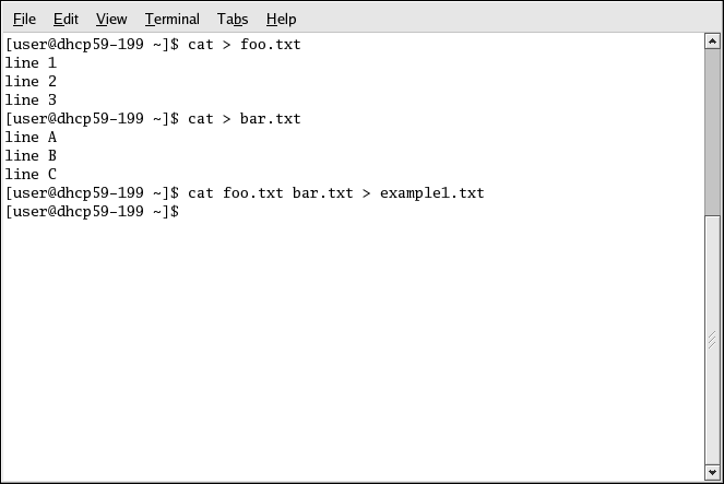 The following screen demonstrates cat's concatenate function, adding the contents of bar.txt to the end of foo.txt. Without redirection to the file example1.txt, cat displays the concatenated contents of foo.txt and bar.txt on the screen.