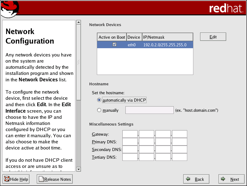 Once you have selected a network device, click Edit. From the Edit Interface pop-up screen, you can choose to configure the IP address and Netmask of the device via DHCP (or manually if DHCP is not selected) and you can choose to activate the device at boot time. If you select Activate on boot, your network interface is started when you boot. If you do not have DHCP client access or you are unsure what to provide here, please contact your network administrator.