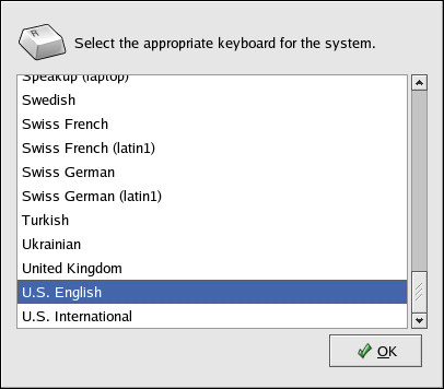 Select a keyboard layout from the list (for example, U.S. English) and click OK. For changes to take effect, you should log out of your graphical desktop session and log back in.