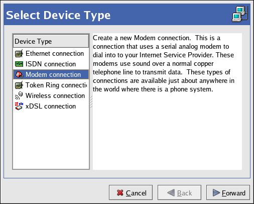 Red Hat Enterprise Linux includes the Internet Configuration Wizard. The Internet Configuration Wizard is available from the Applications (the main menu on the panel) => System Tools sub-menu, or from a shell prompt via the command internet-druid. This tool guides you step-by-step through the process of establishing a new Internet connection.