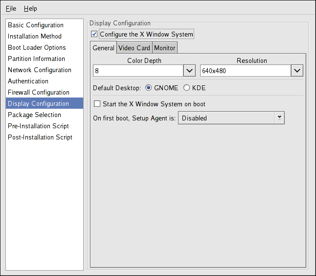 If you are installing the X Window System, you can configure it during the kickstart installation by checking the Configure the X Window System option on the Display Configuration window as shown in Figure 2-11. If this option is not chosen, the X configuration options are disabled and the skipx option is written to the kickstart file.