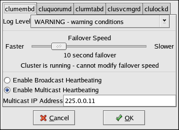 To change a cluster daemon's logging level on all cluster members, use the Cluster Configuration Tool and choose Cluster => Daemon Properties. Specify the daemon using the tabs, and the severity level for each daemon using the pull down menu. The following list defines each severity level: